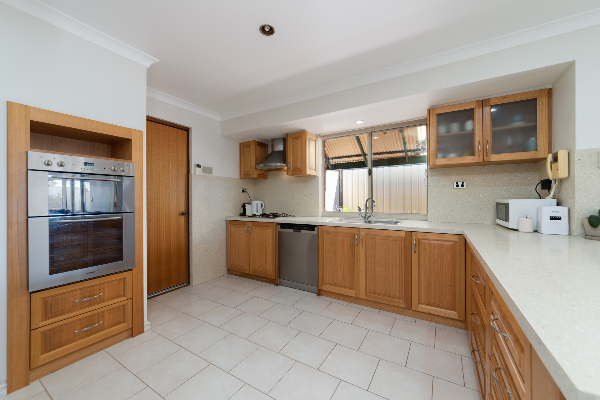 Extras include a secure double lock-up garage with internal shopper’s entry via the kitchen, a practical main family bathroom with a bathtub and showerhead, a separate second toilet off the laundry, evaporative air-conditioning, and a gas bayonet for heating, feature skirting boards, ceiling fans and tiled low-maintenance flooring.